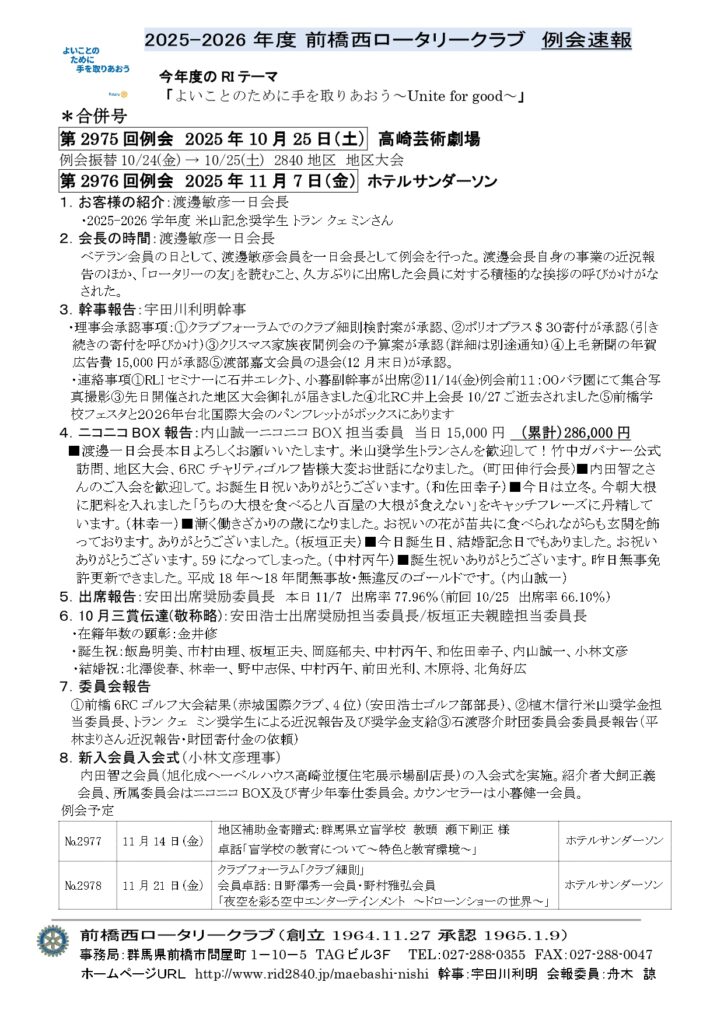 2025年11月7日 №2975・№2976週報 例会速報 2025.11.13 2025.11.13 この記事のタイトルとURLをコピーする 2025年10月17日 №2974週報 例会速報 前の記事