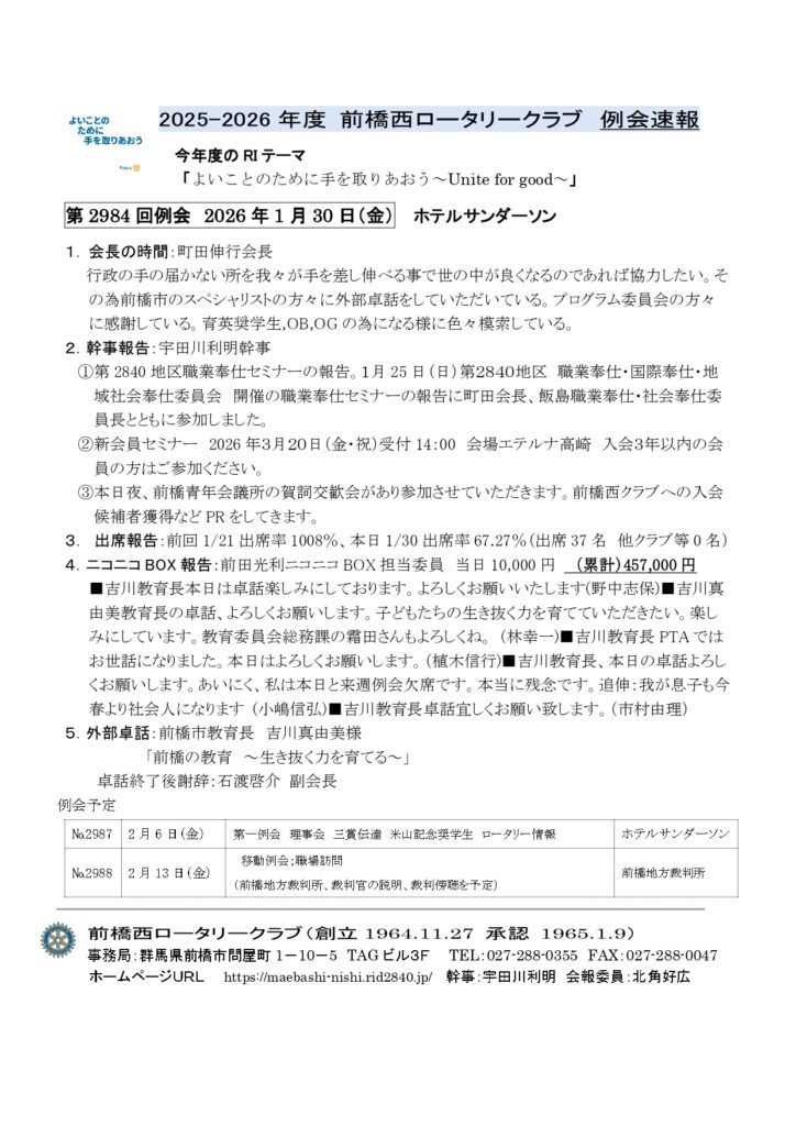 2026年1月30日 №2986週報 例会速報 2026.02.06 2026.02.06 この記事のタイトルとURLをコピーする 2026年1月21日 №2985週報 例会速報(前橋6RC合同新年例会) 前の記事